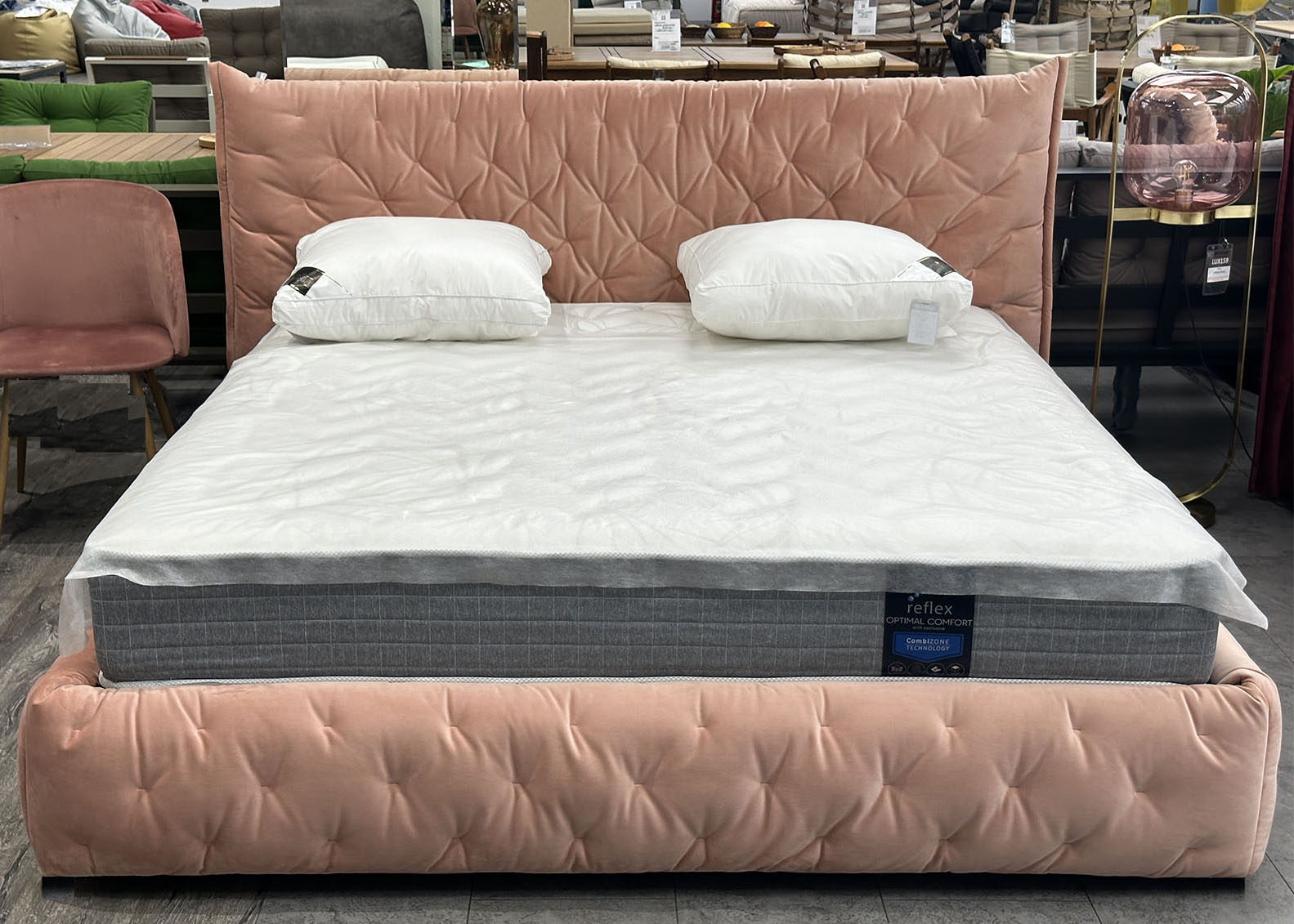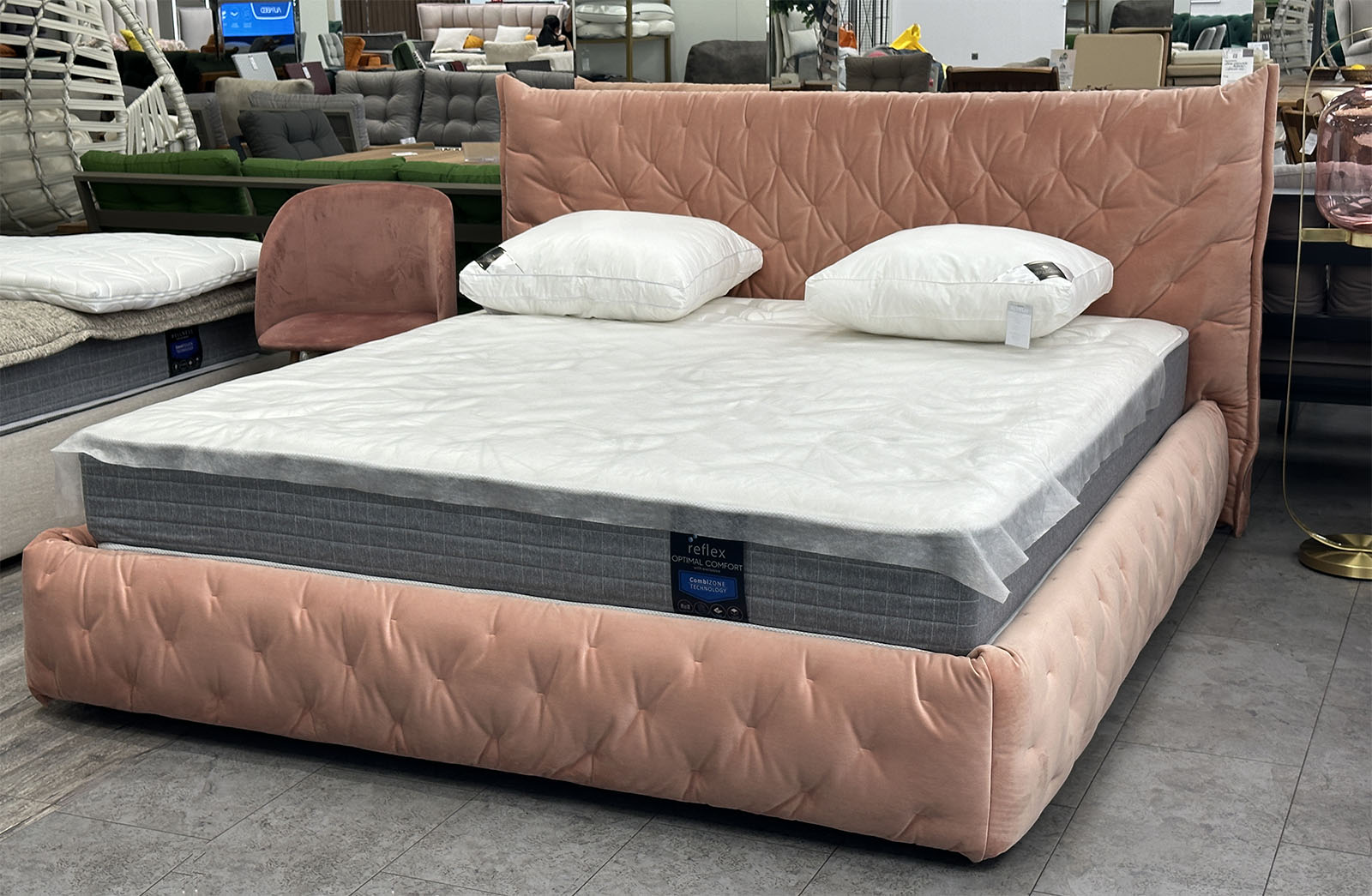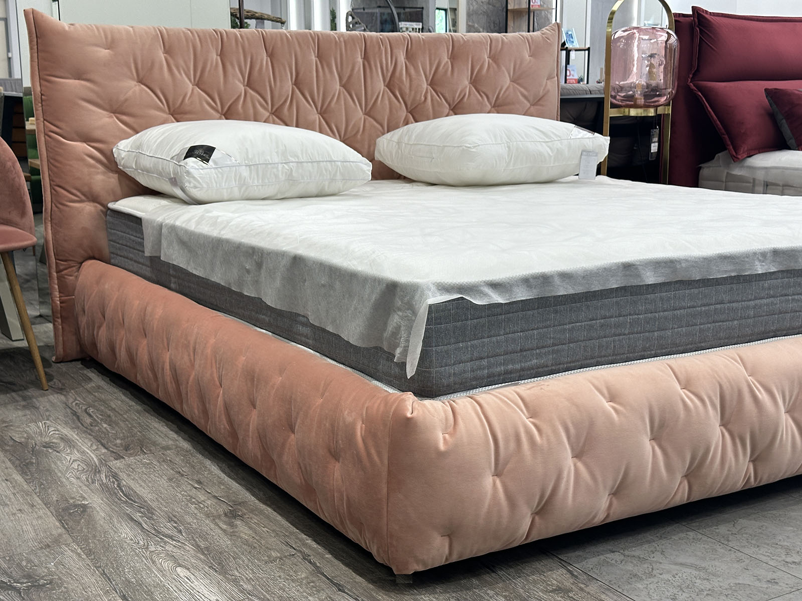 Обивка кровати: высококачественный велюр коралового цвета с высоким ворсом.