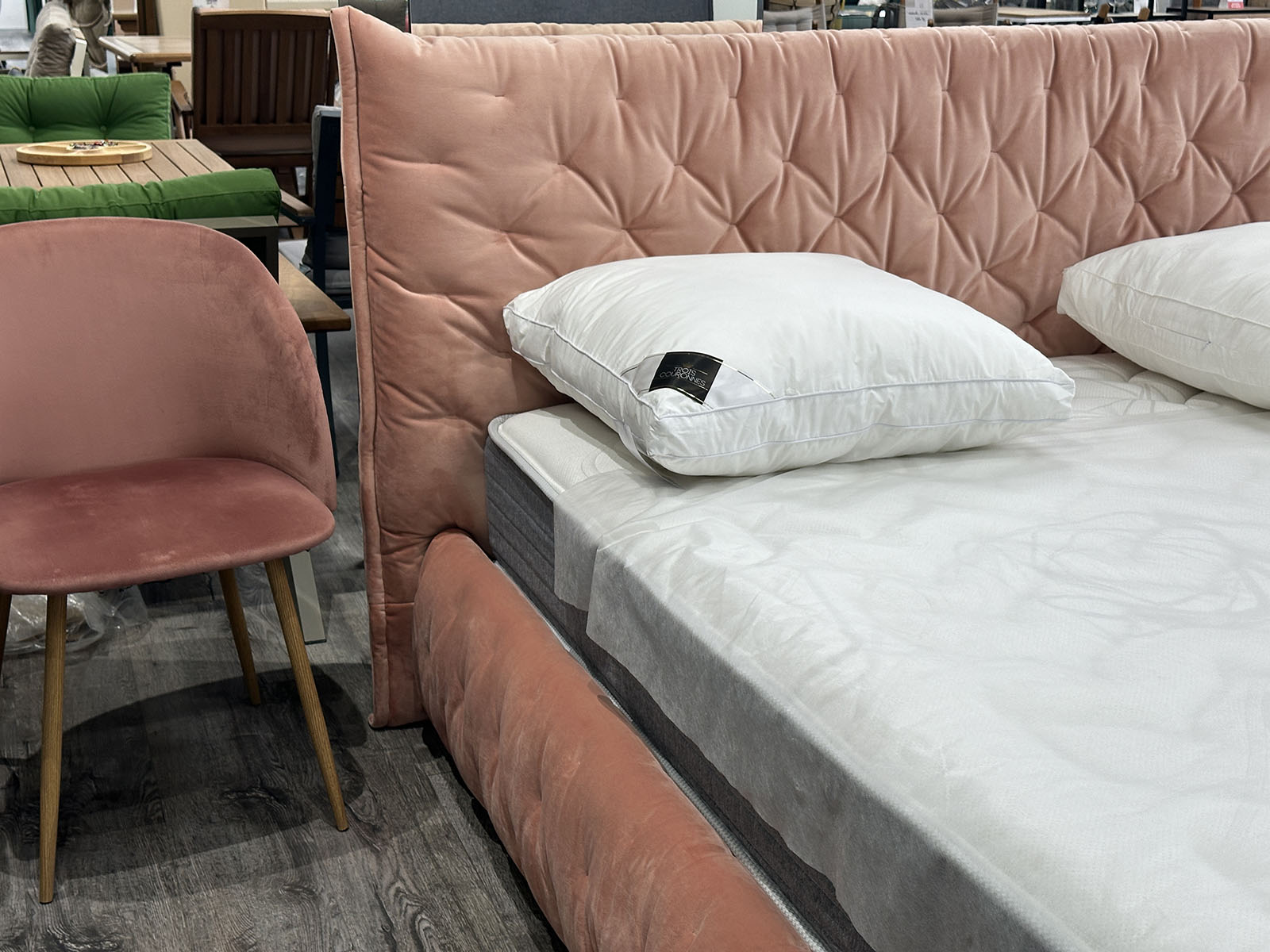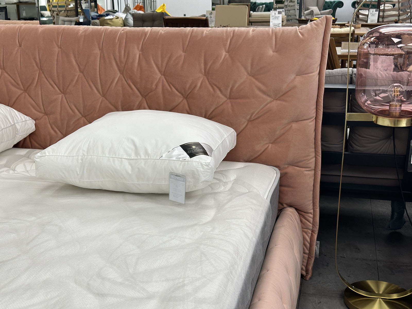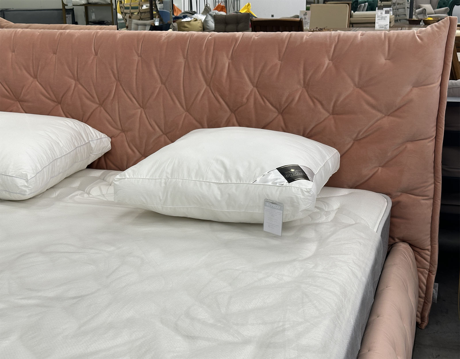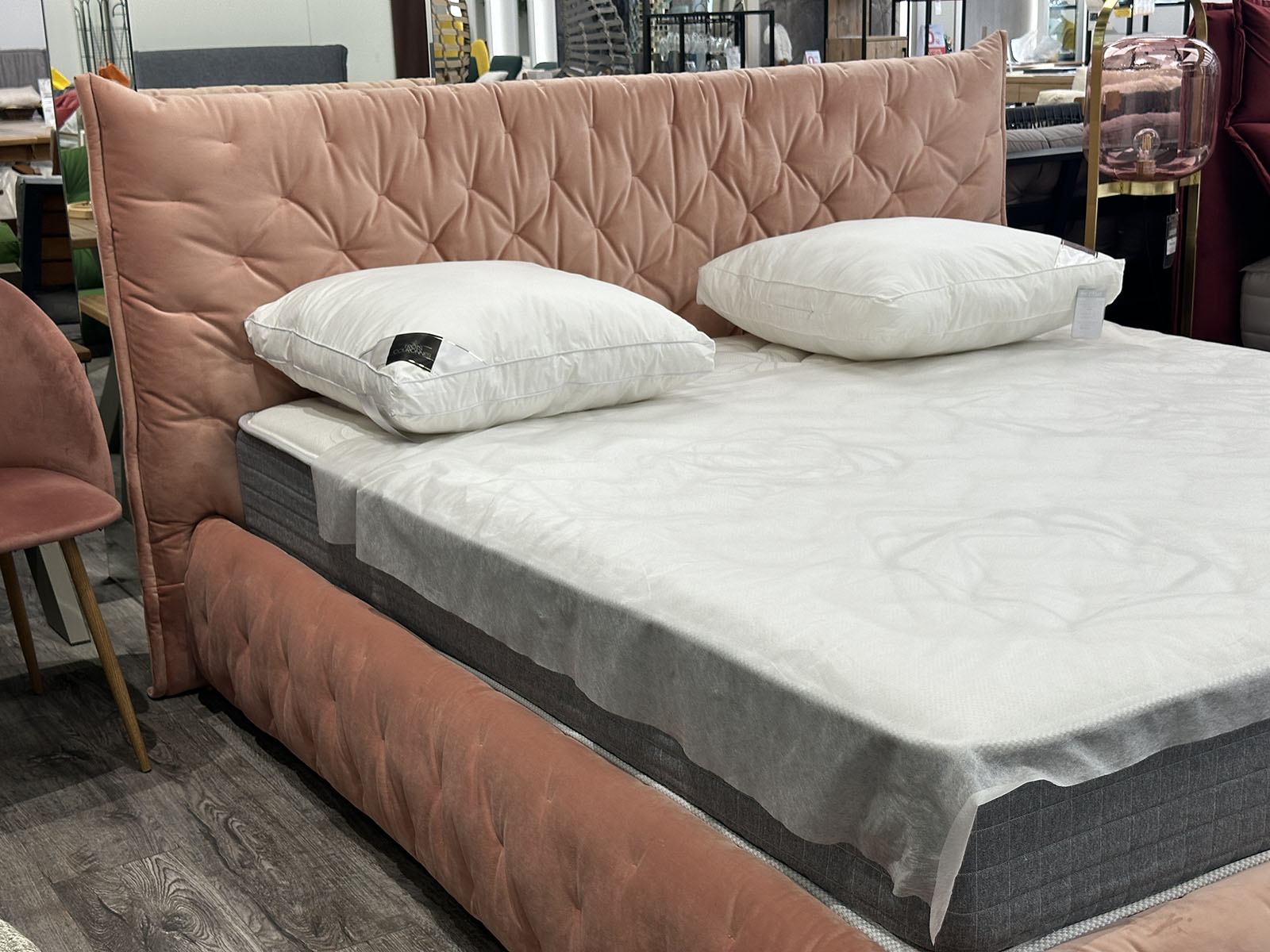 Интерьерная уютная кровать в дизайнерской обивке нежно кораллового цвета.