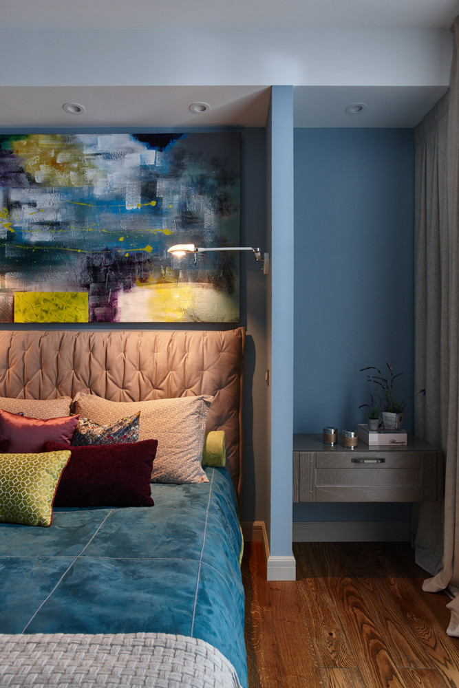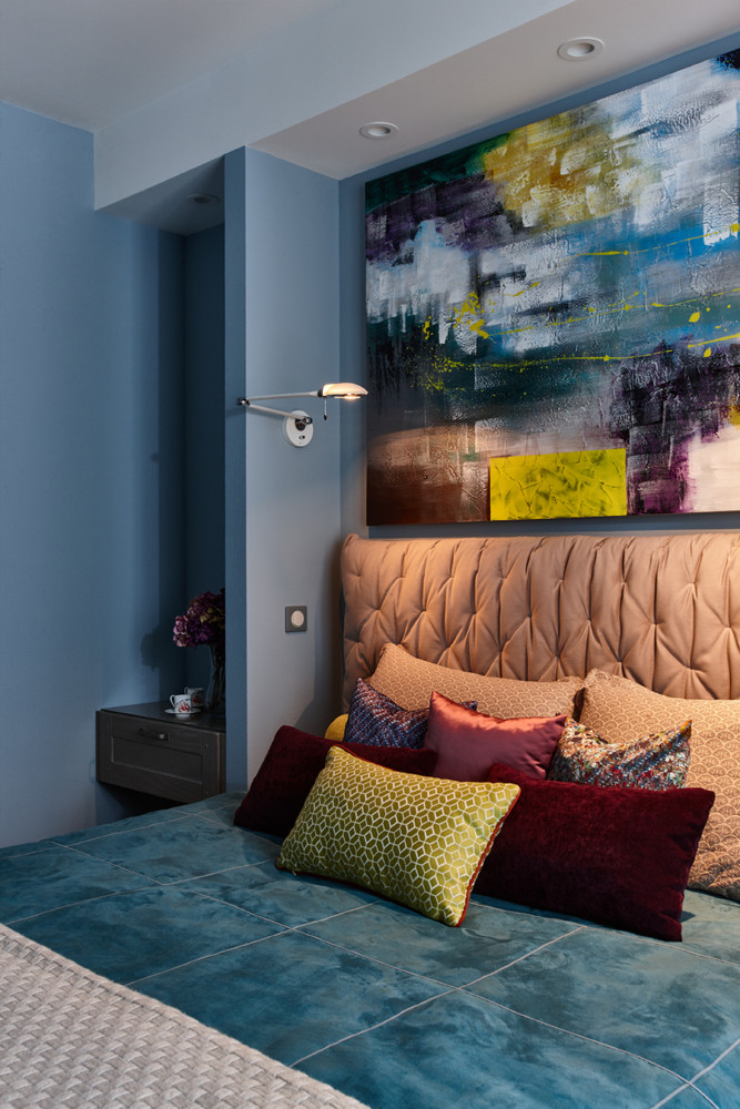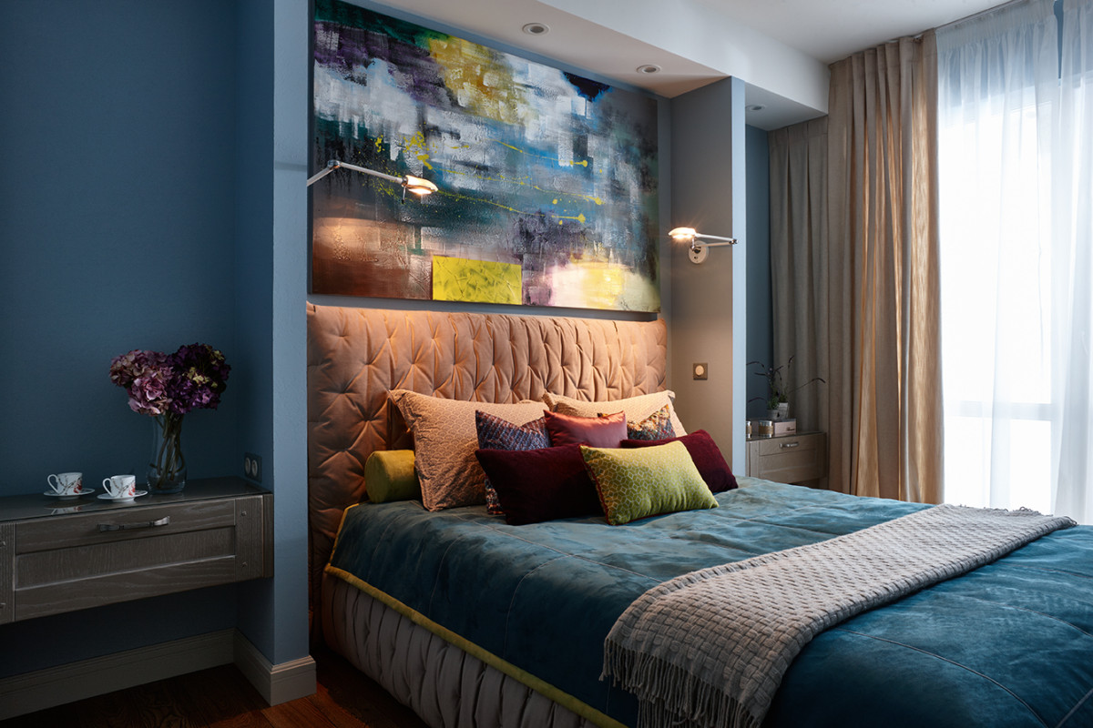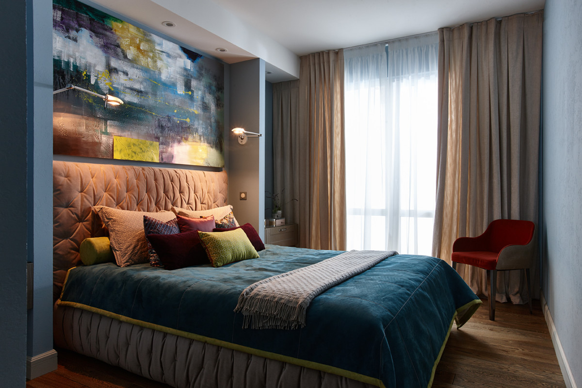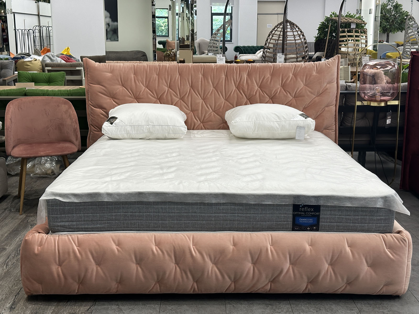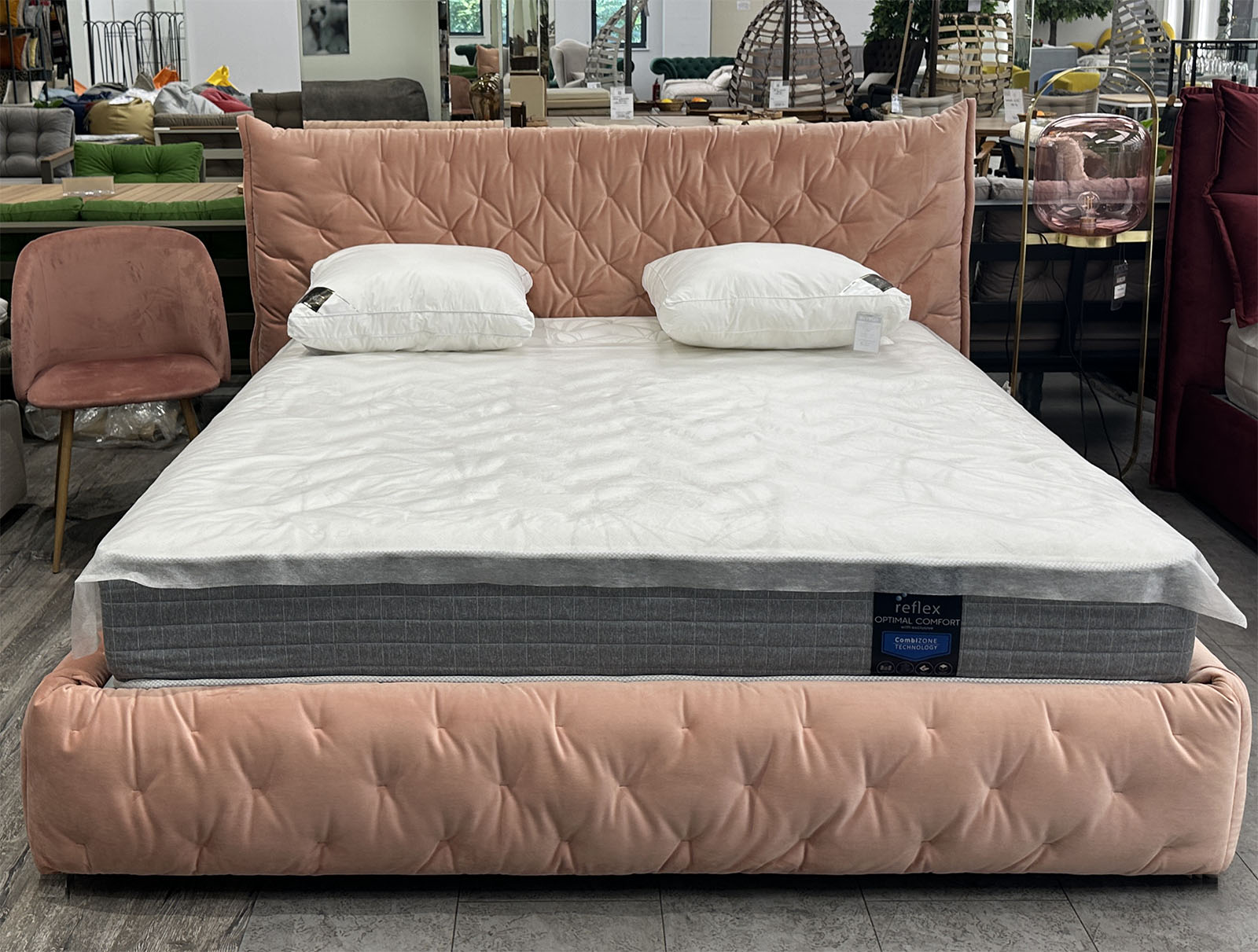 Интерьерная уютная кровать в дизайнерской обивке нежно кораллового цвета.