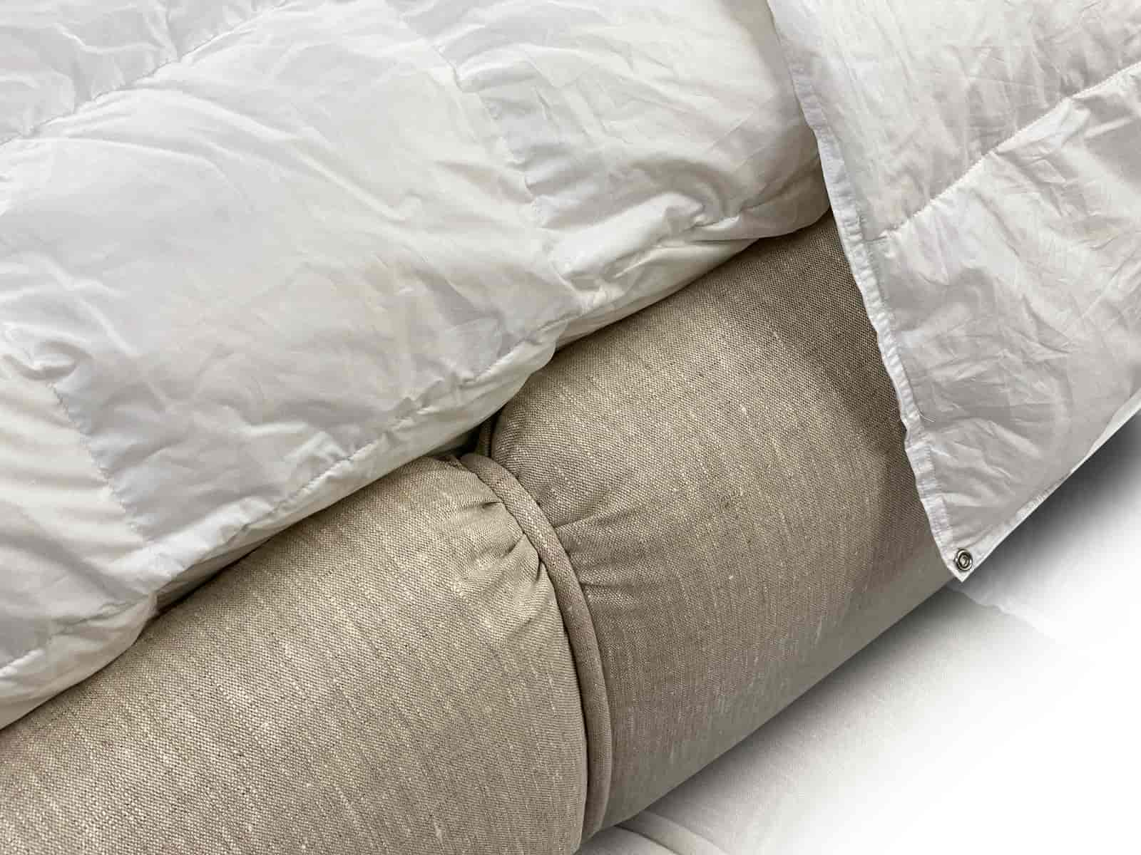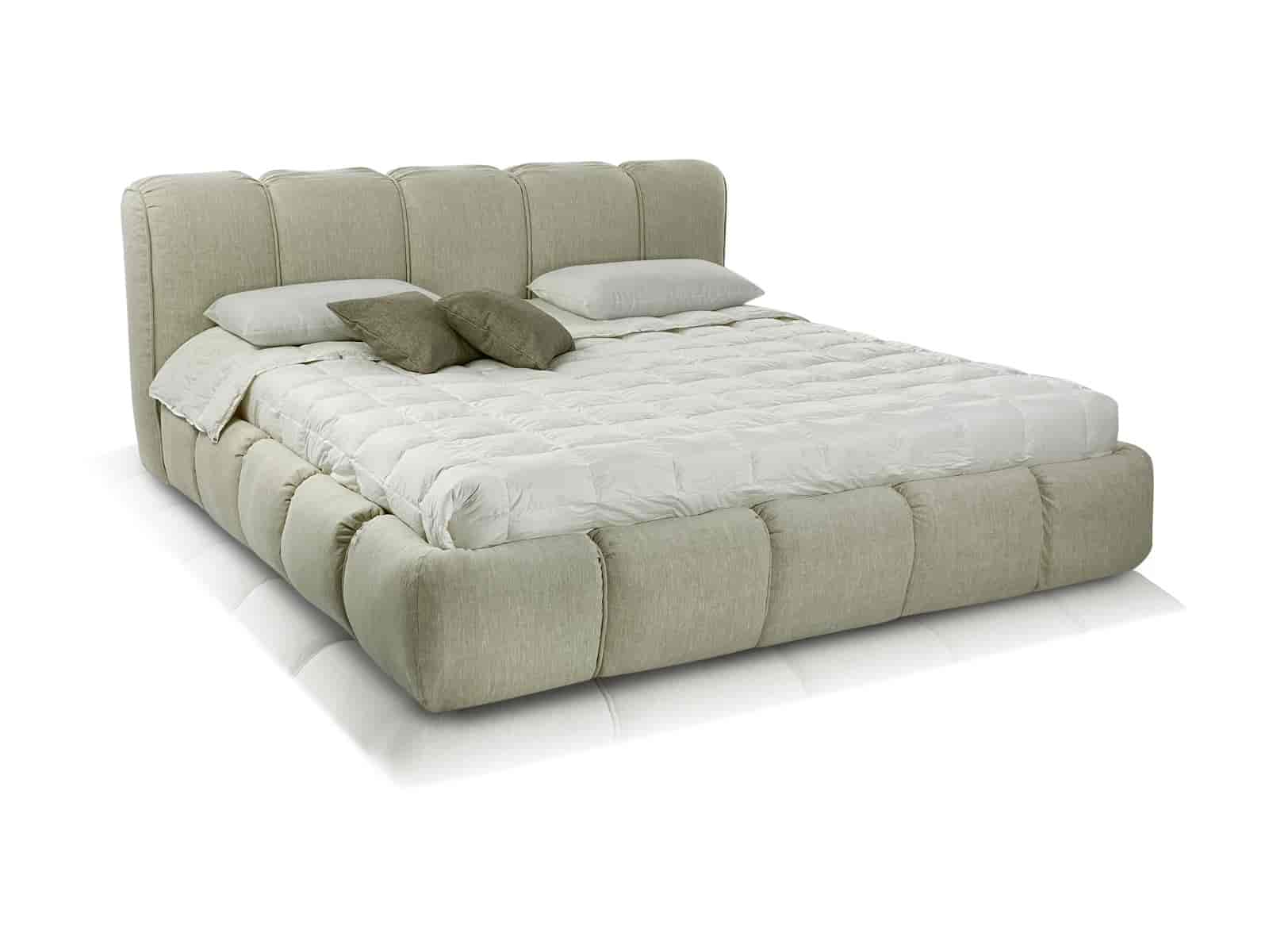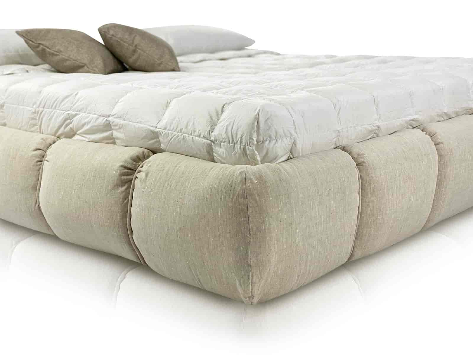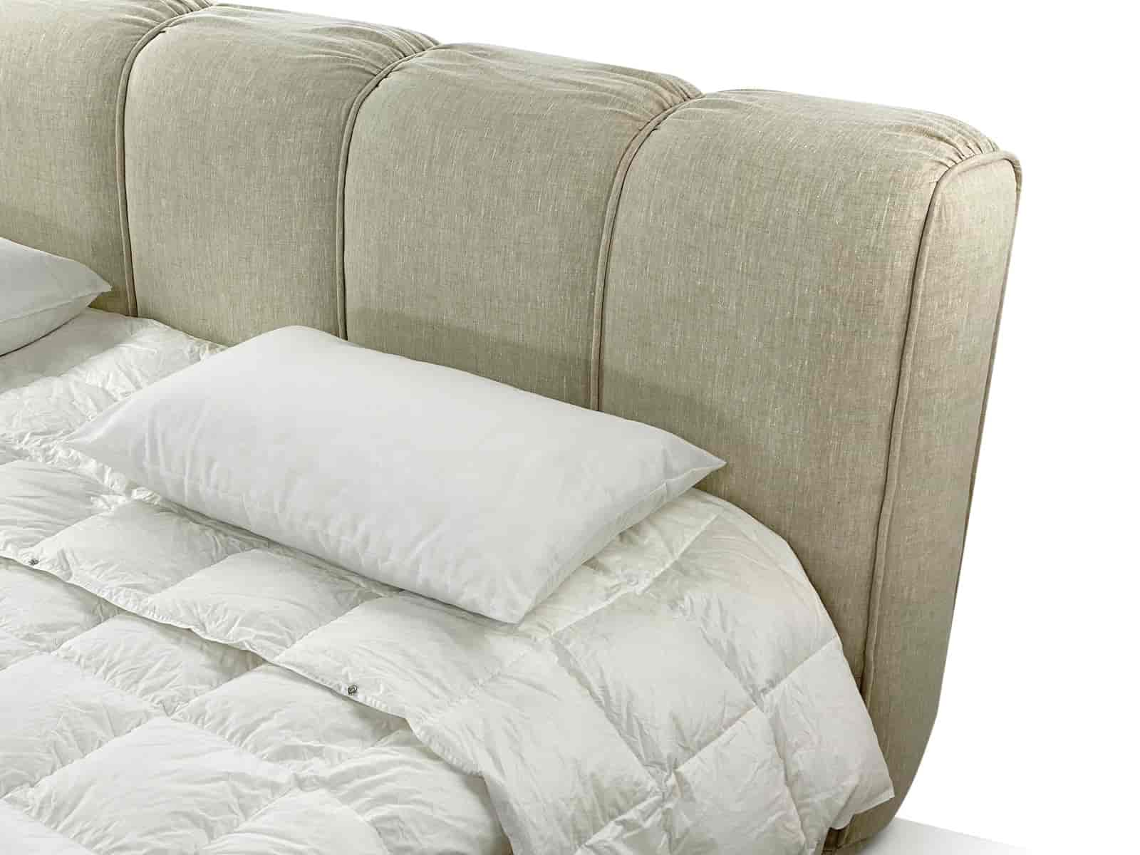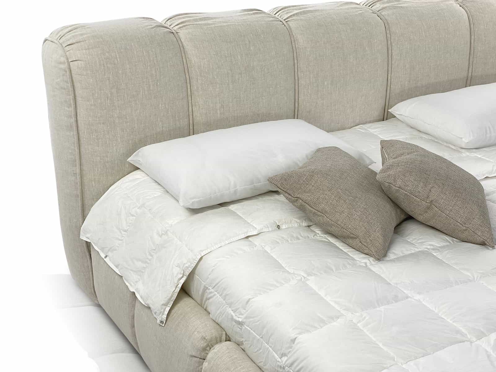 Caracteristici de design: un pat tapițat confortabil, voluminos, cu pereți laterali umflați și o pernă mare integrată ca tăblie.