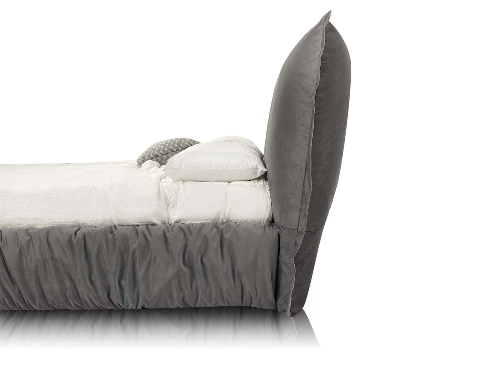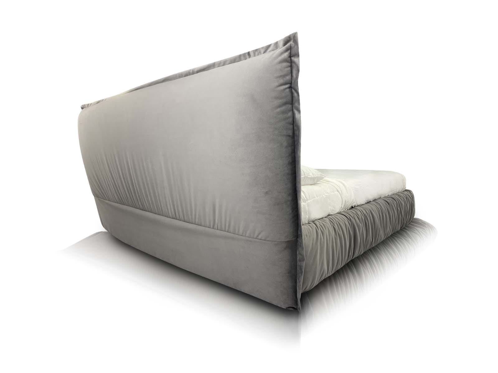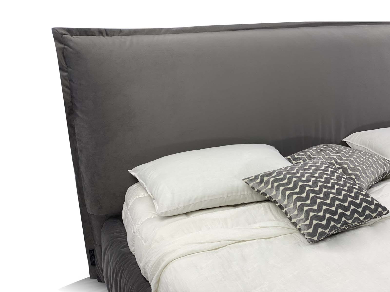 Caracteristici de design: un pat tapițat confortabil, voluminos, cu pereți laterali umflați și o pernă mare integrată ca tăblie.