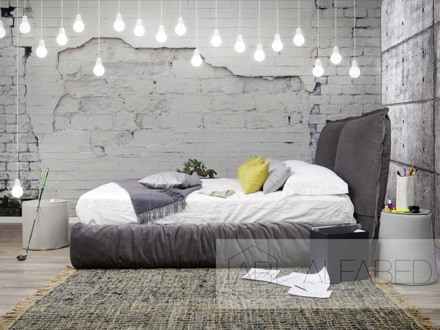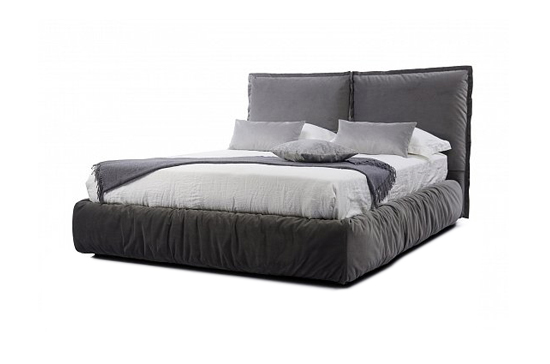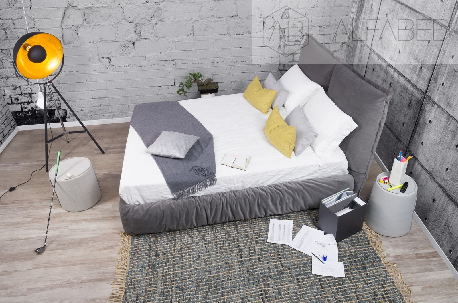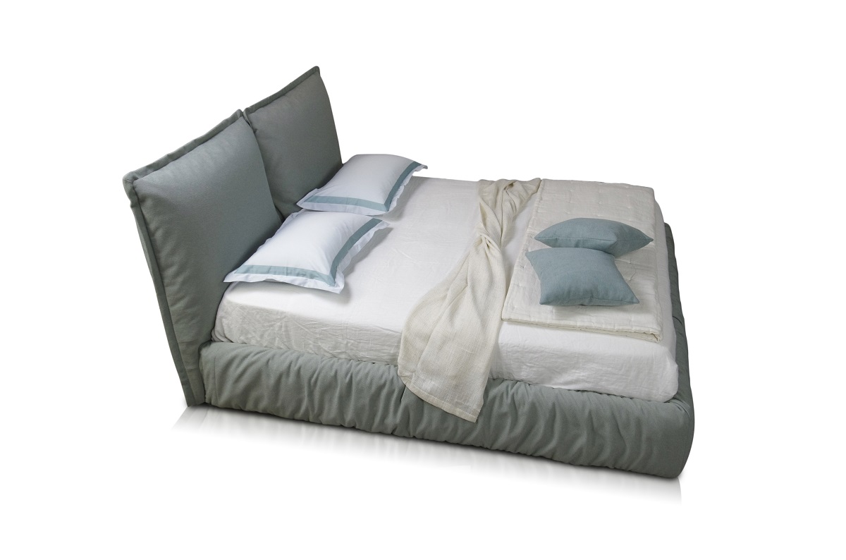 Caracteristici de design: un pat tapițat confortabil, voluminos, cu pereți laterali umflați și o pernă mare integrată ca tăblie.