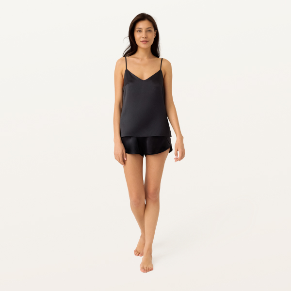 Top cu croială clasică și decolteu în V, realizat din mătase organică 100% naturală, se potrivește delicat corpului. Ținuta lejeră și bretelele reglabile oferă confort maxim, în timp ce mătasea naturală permite pielii să respire.
