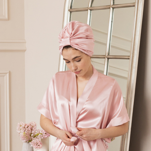 Un turban din mătase naturală învăluie delicat părul, protejându-l de