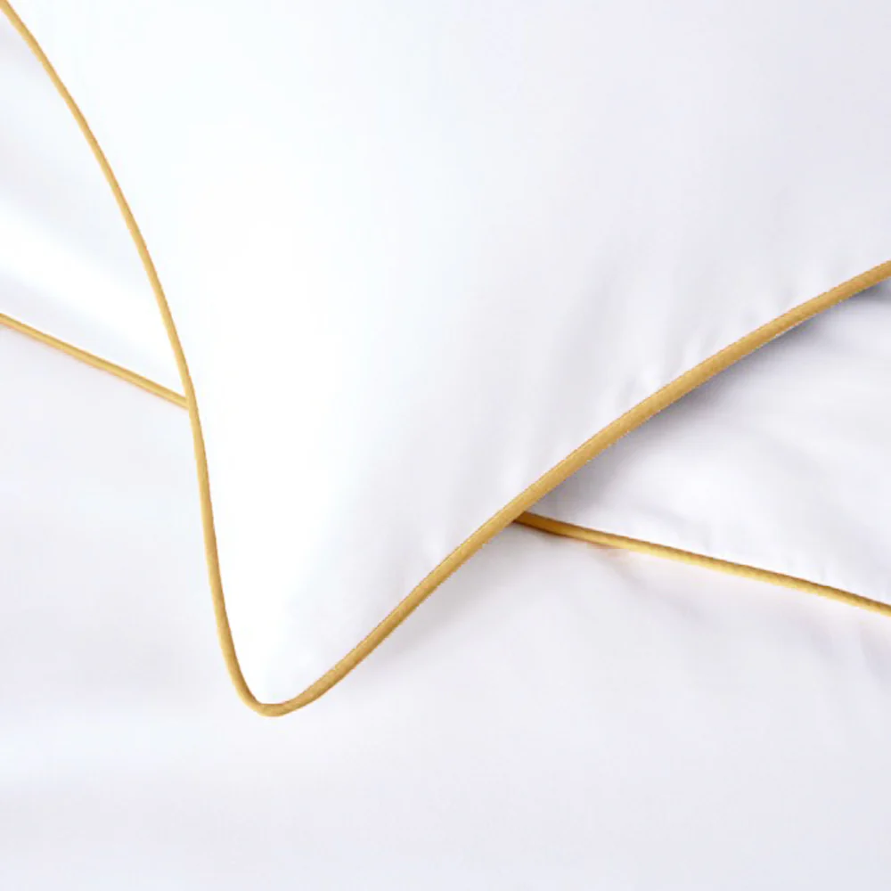 Пододеяльник c декоративной отделкой кантиком золотого цвета произведен из высококачественного длинноволокнистого хлопка сатинового плетения.