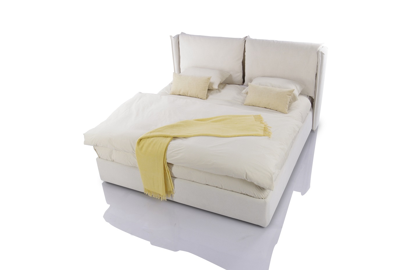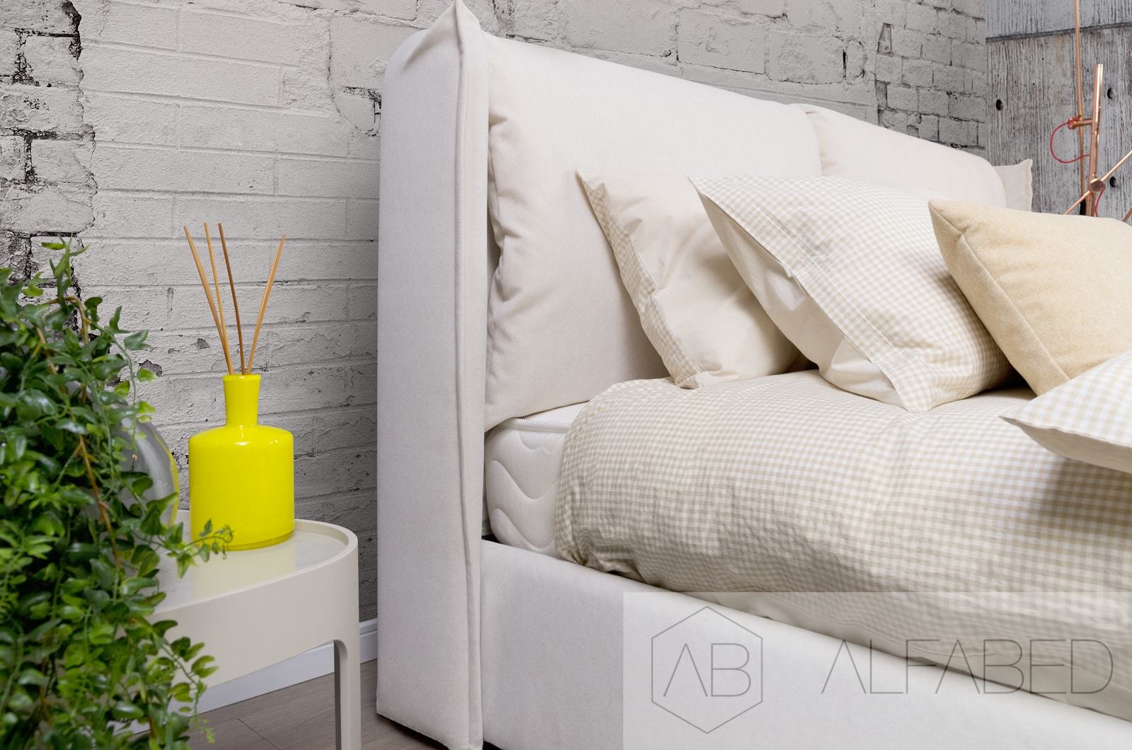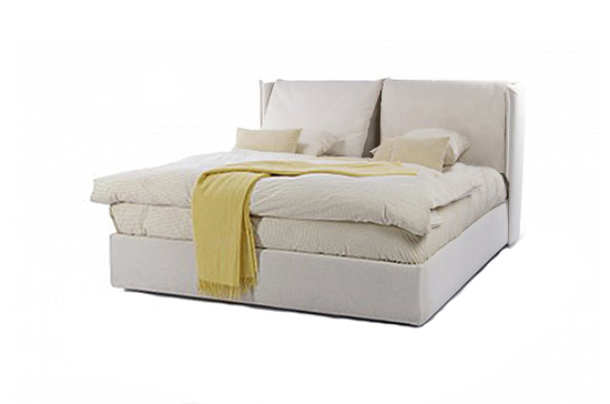 Элегантный дизайн, спинка является главным украшением кровати. Изогнутые линии изголовья украшены двумя мягкими съемными подушками (на молнии).  Ушки создают эффект «обнимания» и уют.