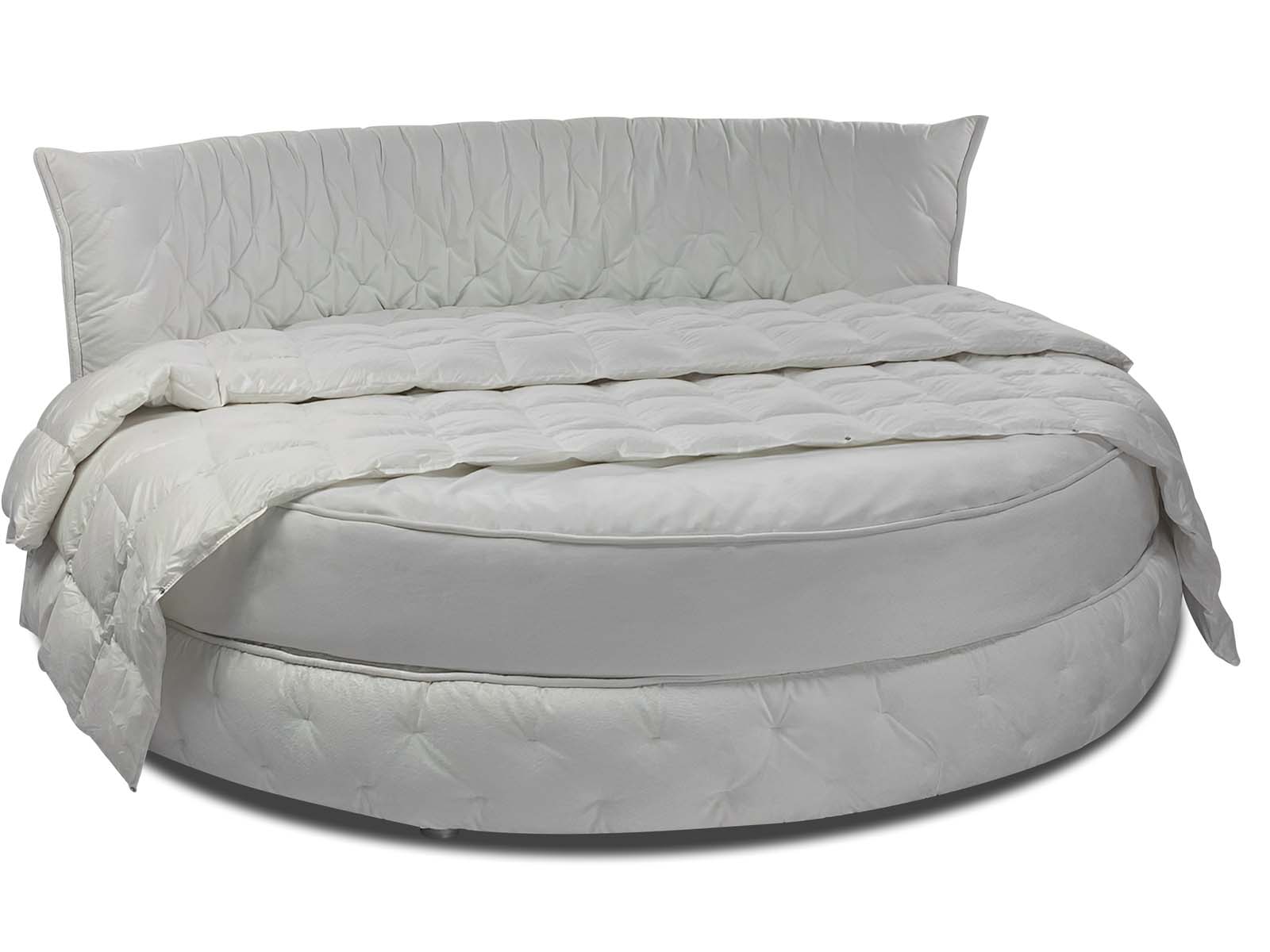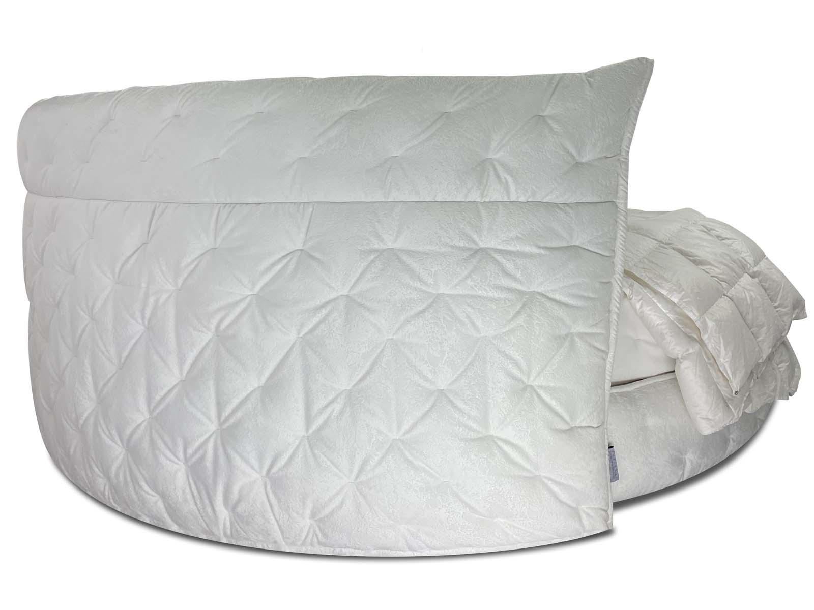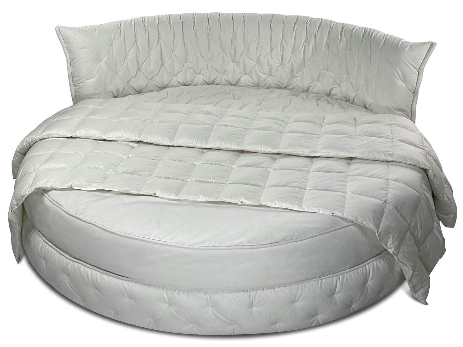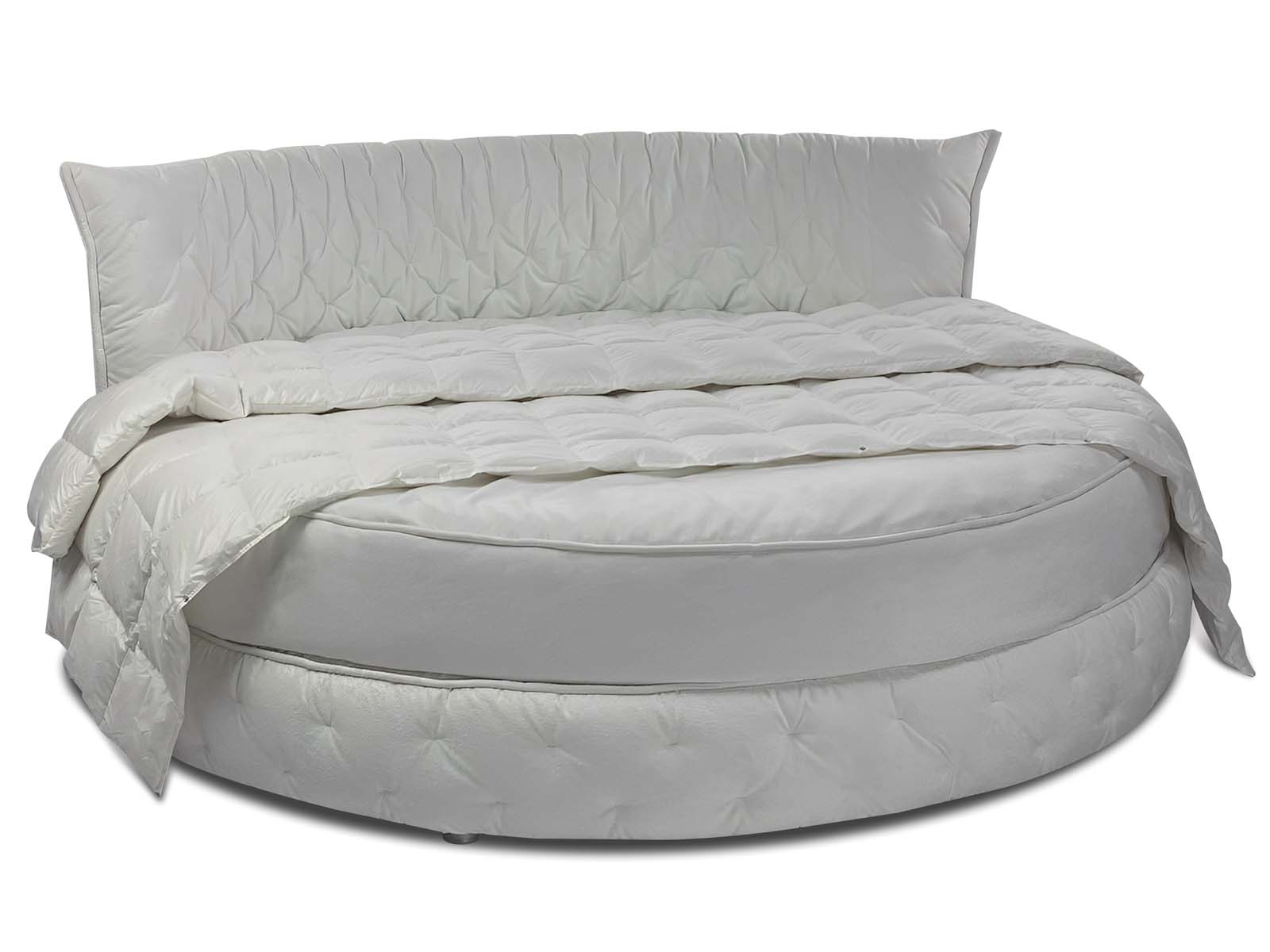 Круглая обволакивающая, нежная и приятная на ощупь кровать с супер мягким изголовьем. Мягкость и объём кровати придает необычная дизайнерская стежка, которая образует легкие складки за счет чего кровать выглядит еще объёмней. Хорошо смотрится в мягких велюрах с высоким ворсом. Идеальное семейное пространство для счастья по фэн-шуй! Большой выбор тканей и цветов отделки. Все чехлы съемные на липучках (можно чистить).