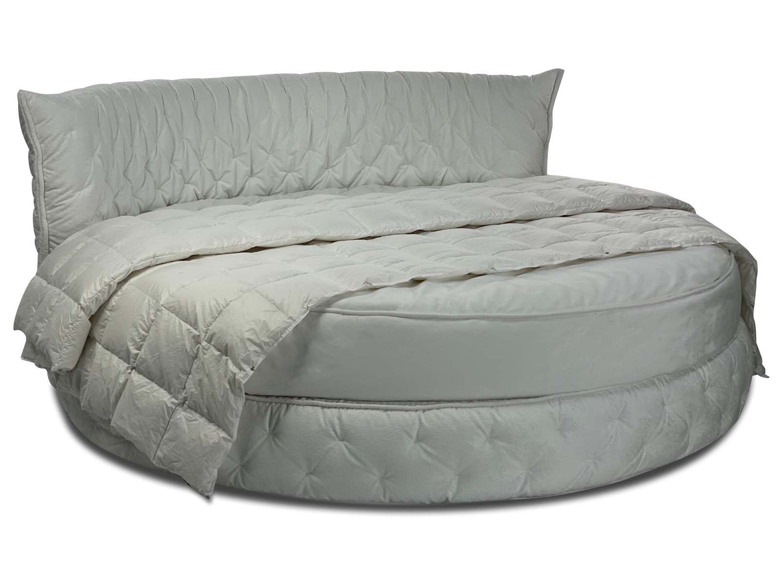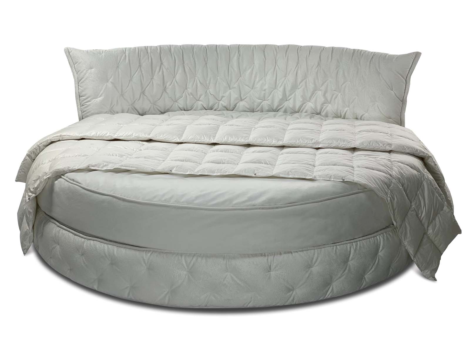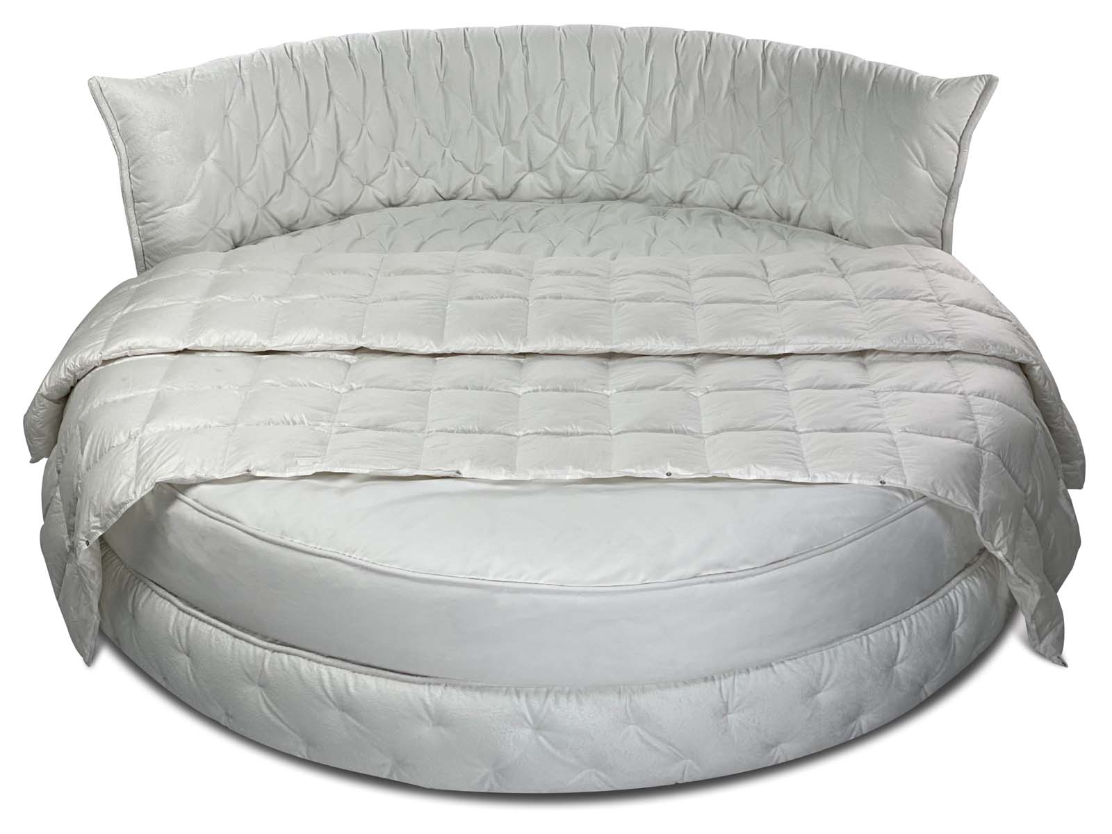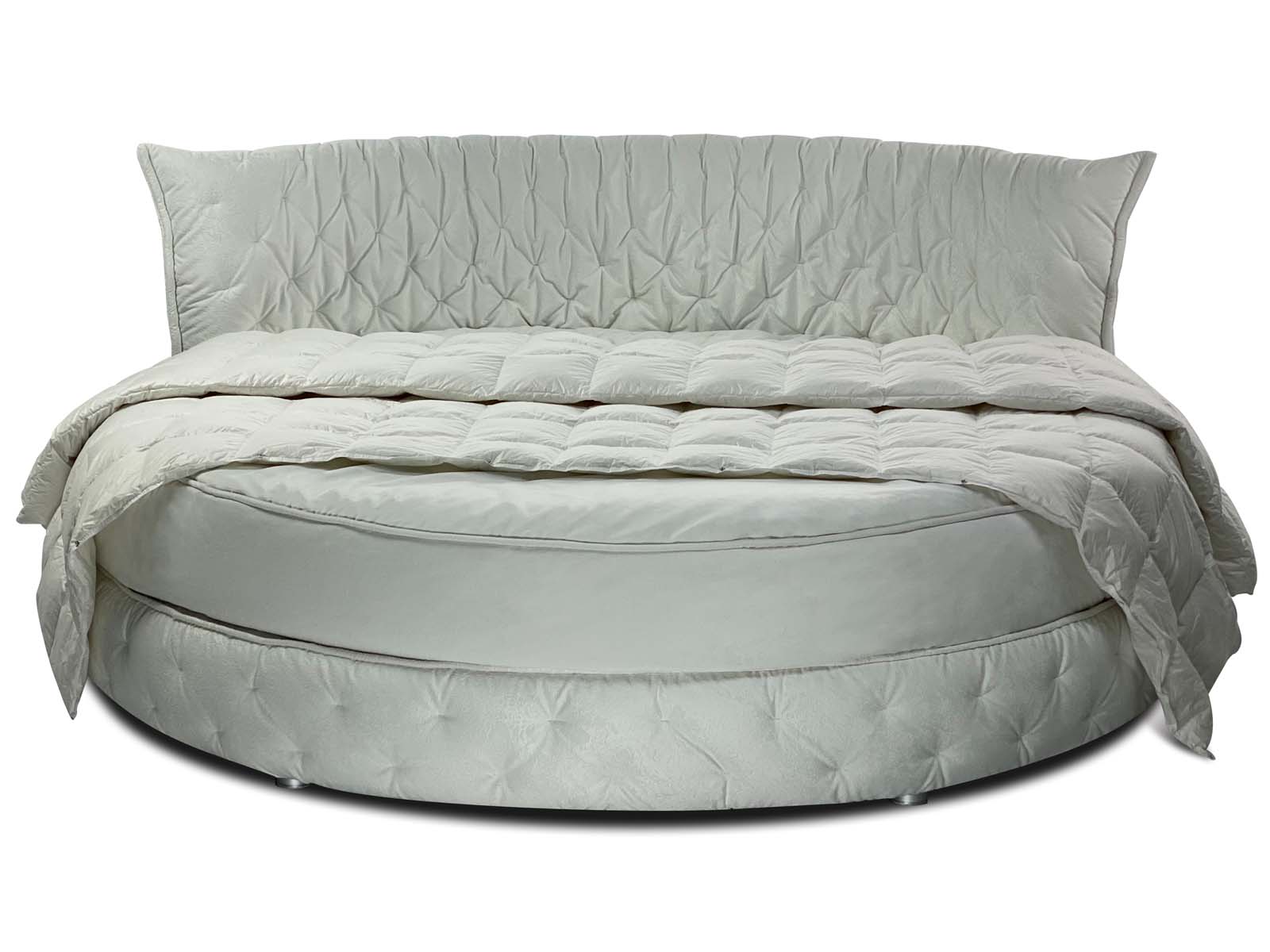 Круглая обволакивающая, нежная и приятная на ощупь кровать с супер мягким изголовьем. Мягкость и объём кровати придает необычная дизайнерская стежка, которая образует легкие складки за счет чего кровать выглядит еще объёмней. Хорошо смотрится в мягких велюрах с высоким ворсом. Идеальное семейное пространство для счастья по фэн-шуй! Большой выбор тканей и цветов отделки. Все чехлы съемные на липучках (можно чистить).