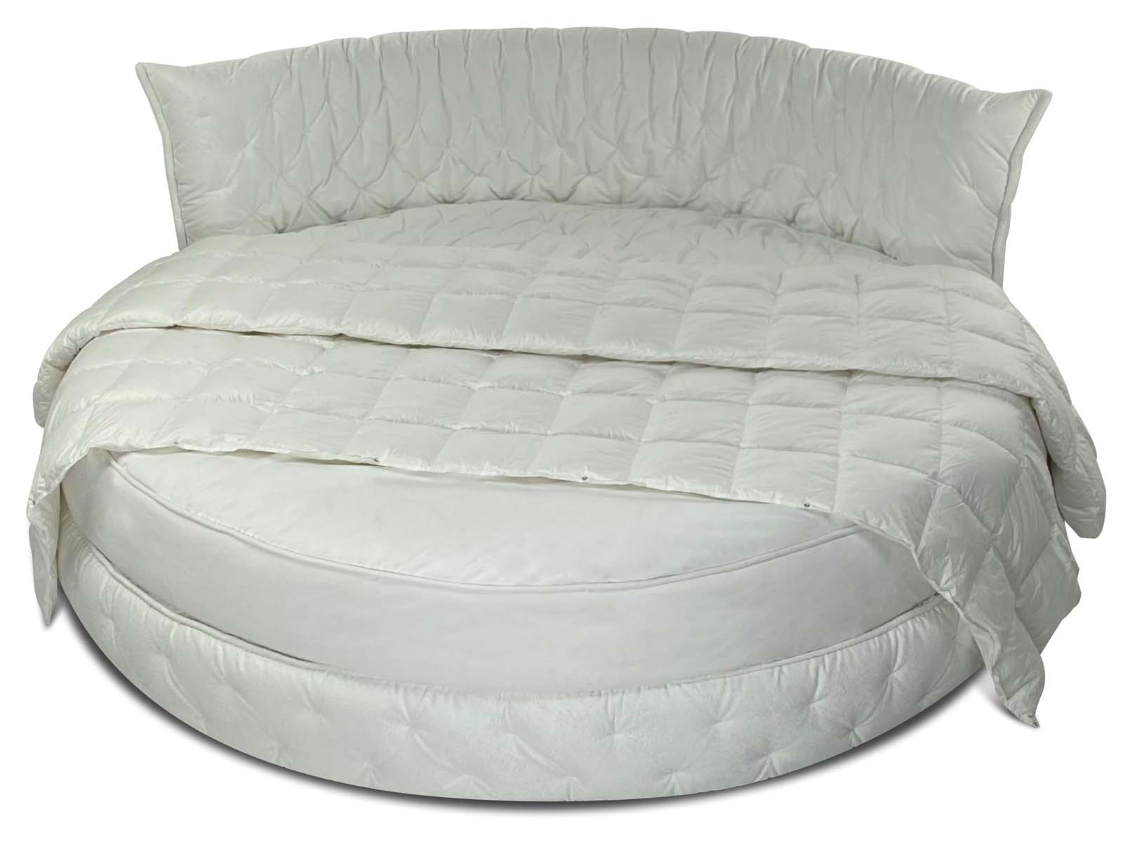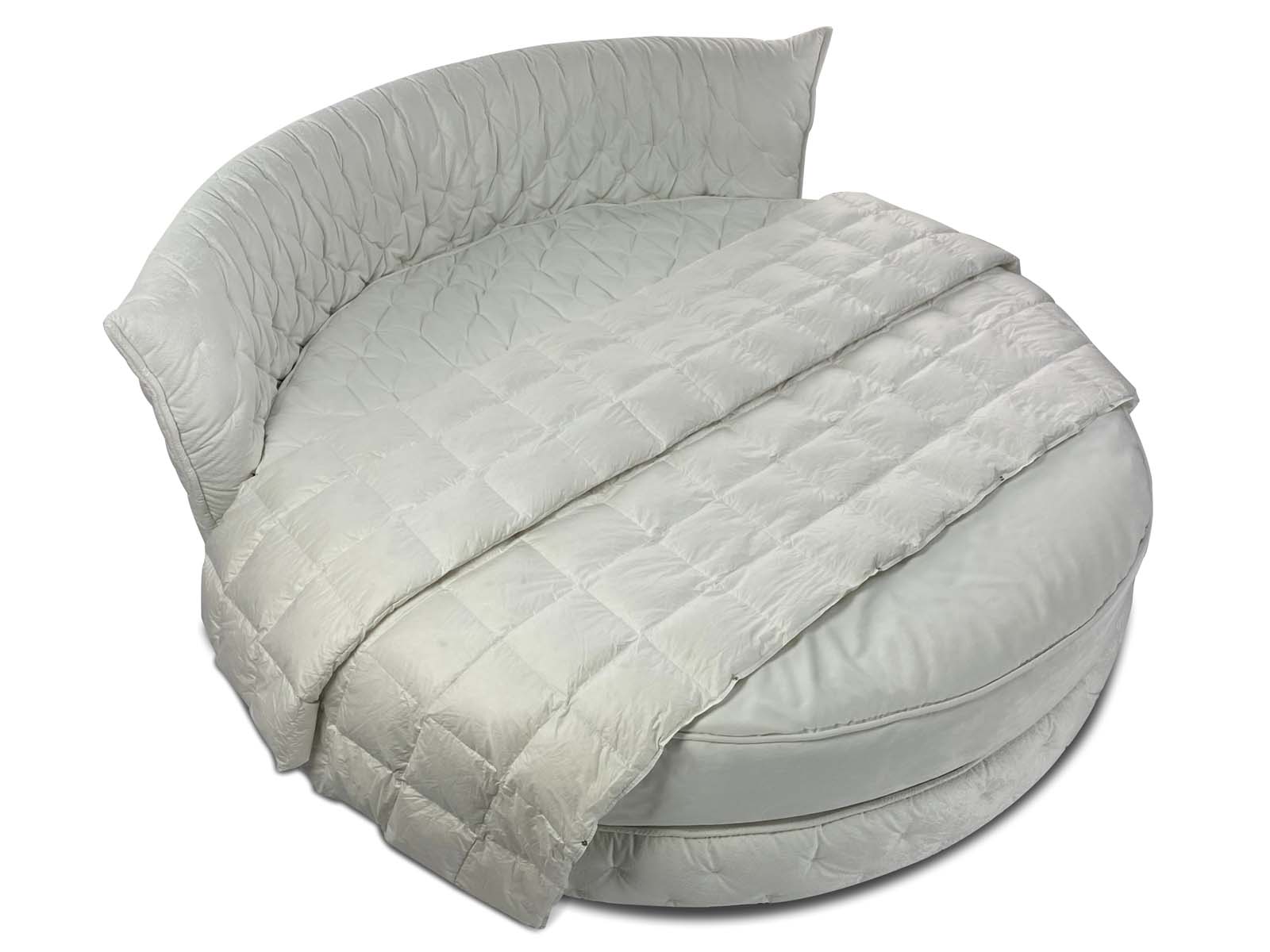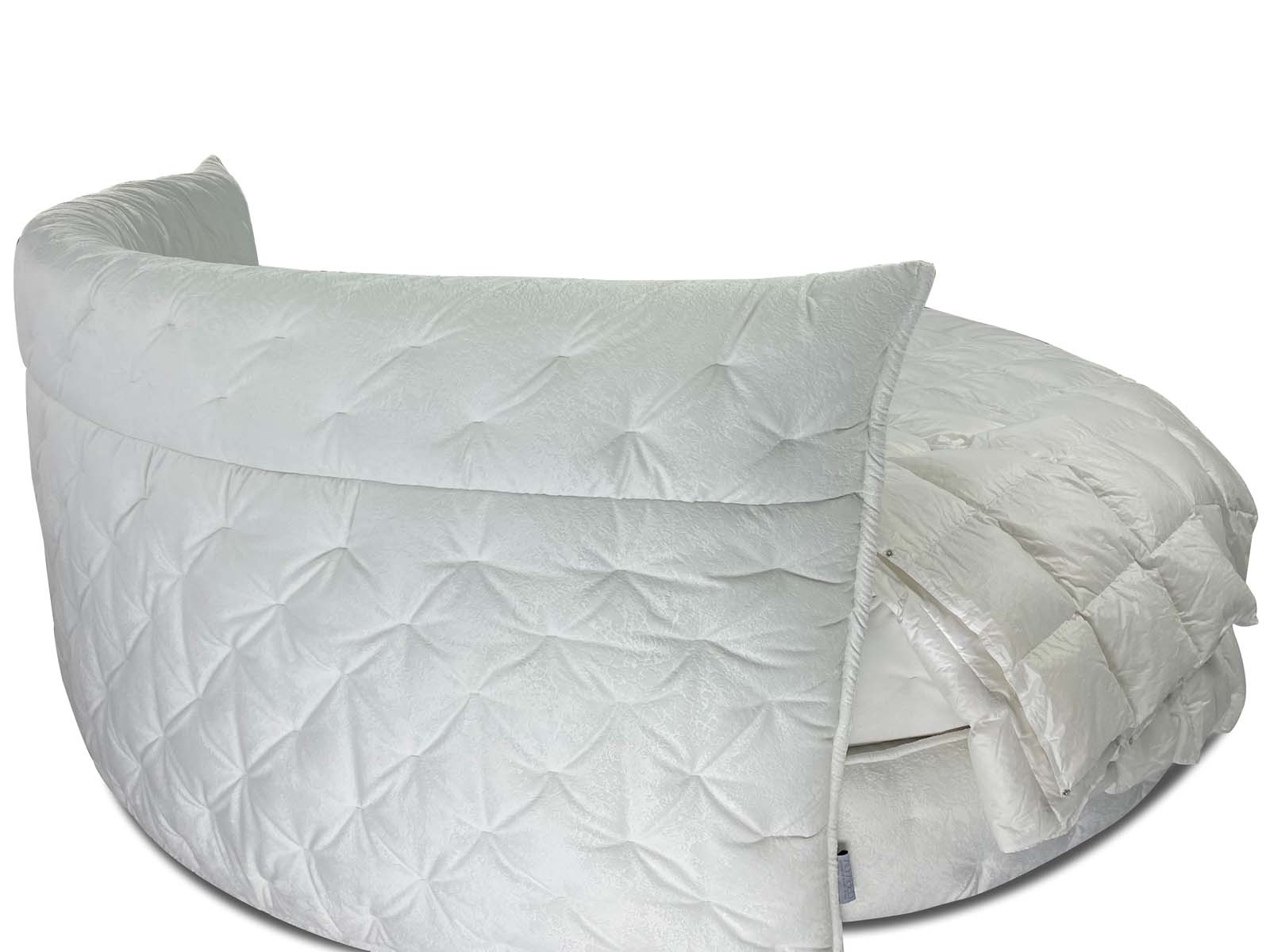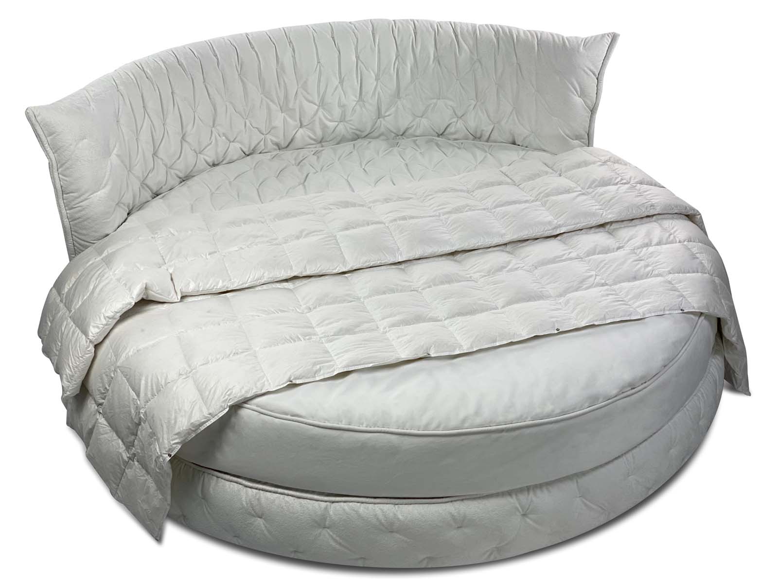 Круглая обволакивающая, нежная и приятная на ощупь кровать с супер мягким изголовьем. Мягкость и объём кровати придает необычная дизайнерская стежка, которая образует легкие складки за счет чего кровать выглядит еще объёмней. Хорошо смотрится в мягких велюрах с высоким ворсом. Идеальное семейное пространство для счастья по фэн-шуй! Большой выбор тканей и цветов отделки. Все чехлы съемные на липучках (можно чистить).