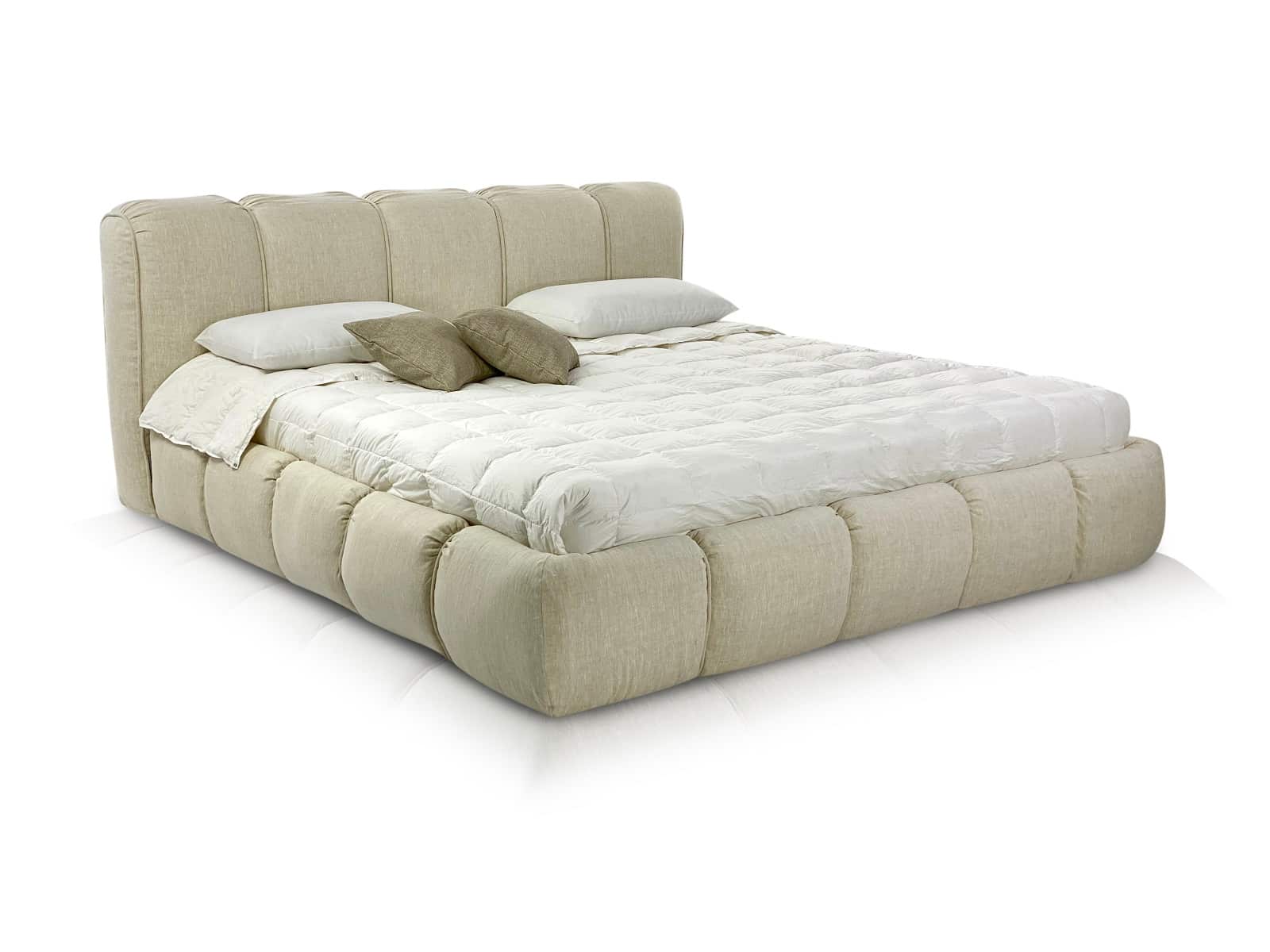 Уютная объемная мягкая кровать с пухлыми боковинами и большой интегрированной подушкой в качестве изголовья. Толщина изголовья 32 см.