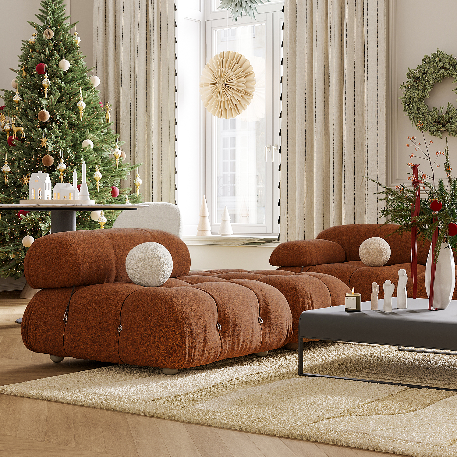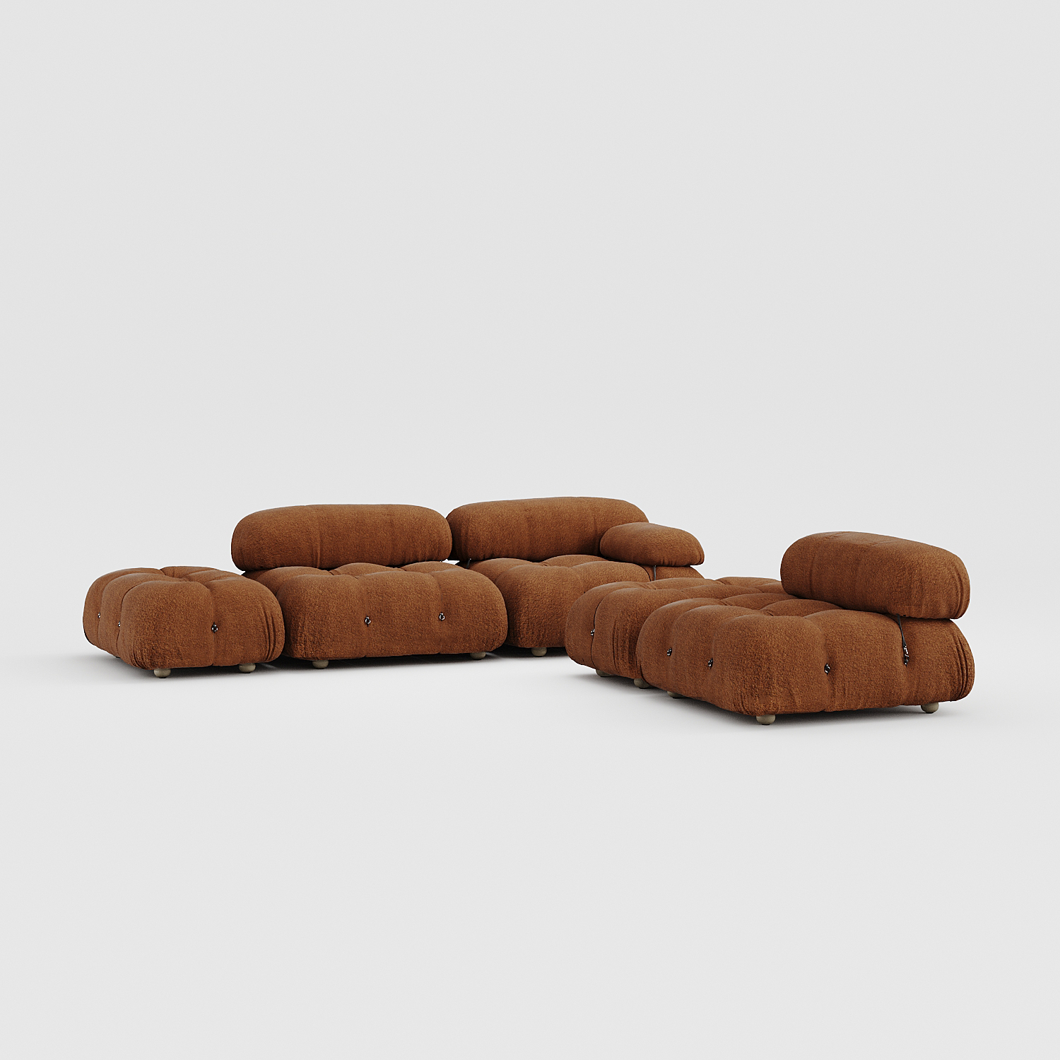 Большой модульный диван, который подстраивается под ваш образ жизни. Три модуля со спинкой и два без – огромное количество вариантов расстановки. Модули можно использовать по отдельности или собирать в единую конструкцию. Несколько вариантов расстановки:– П-образная или угловая конструкция;– соединив два модуля со спинкой и без получится удобная кушетка;– модули – как кресла, пуфы – как место для ног.Стяжка создает объем и мягкость, а необычные круглые ножки добавляют дивану шарма и индивидуальности.