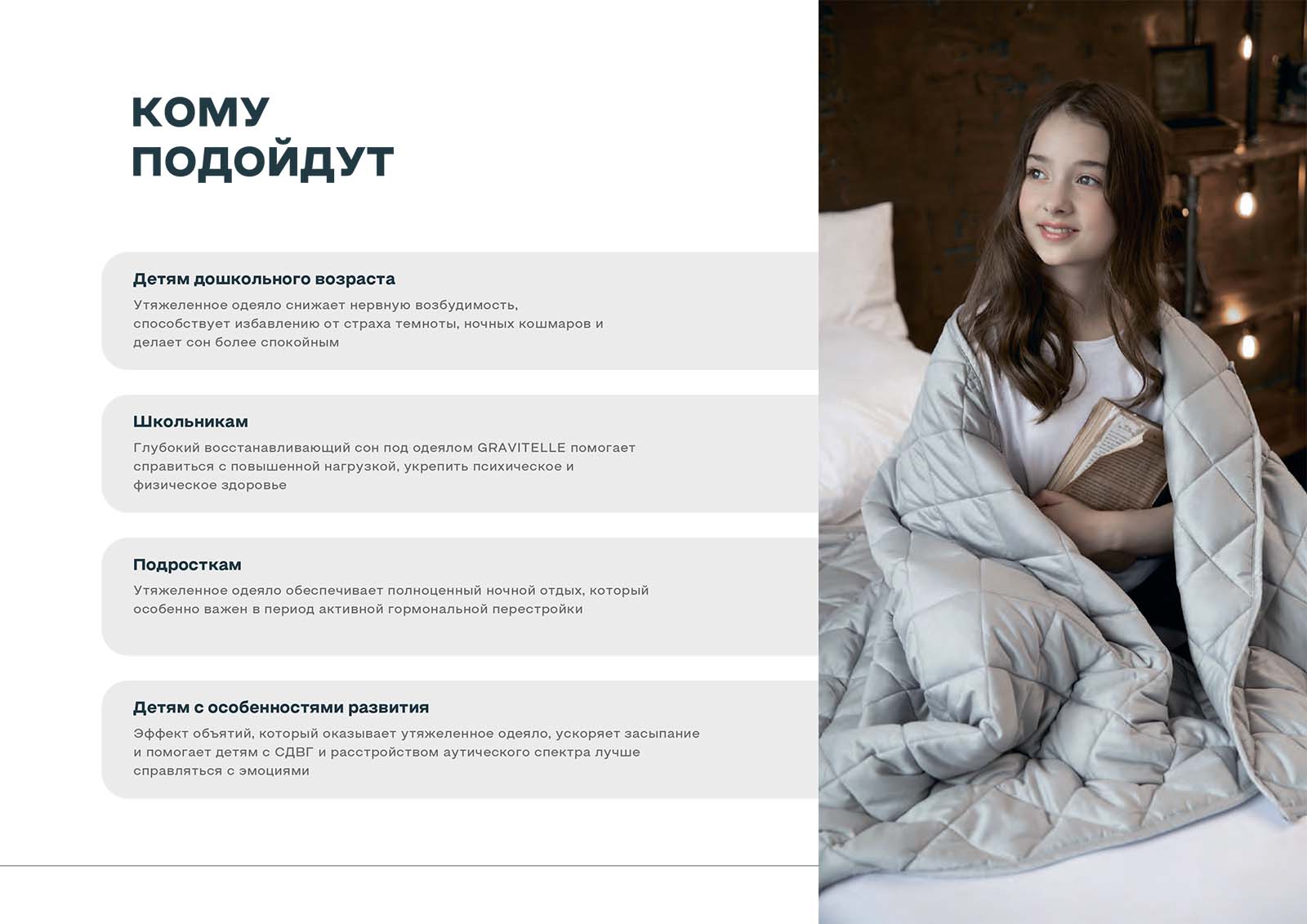 Одеяло с наполнителем из стеклянных микро-гранул обволакивает тело и подсознательно создаёт ощущение материнских объятий, помогает снять тревогу и стресс.
