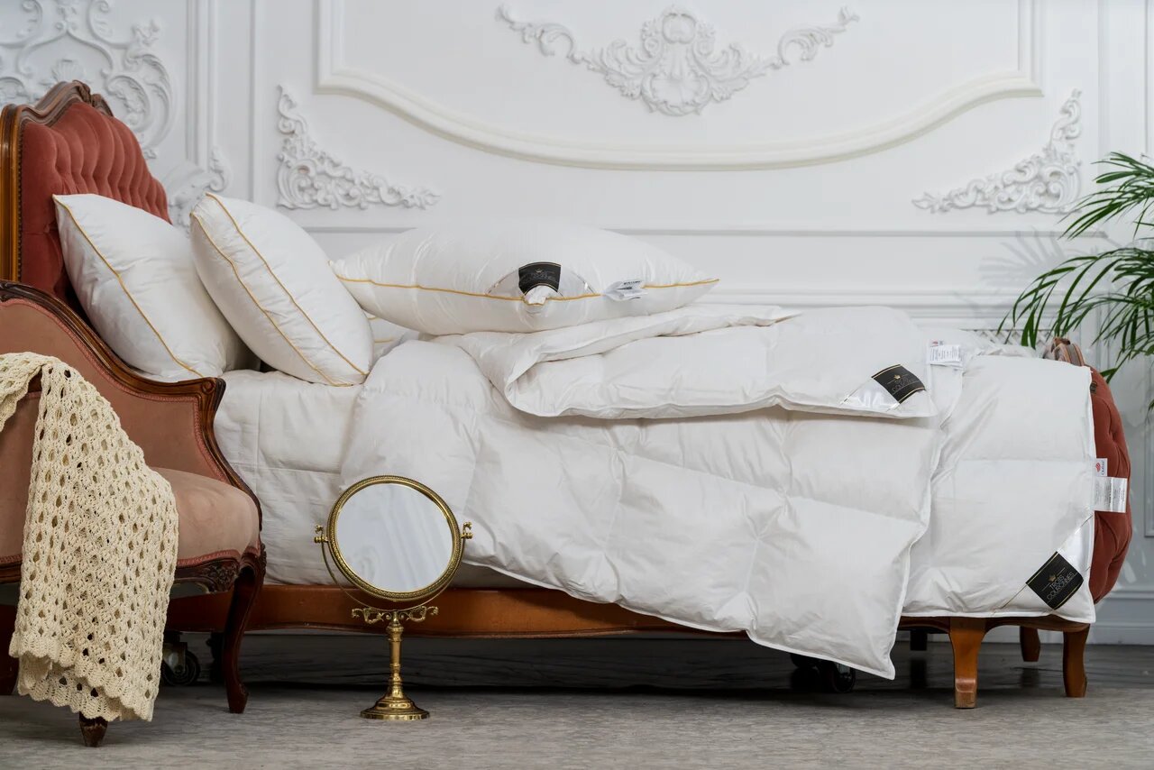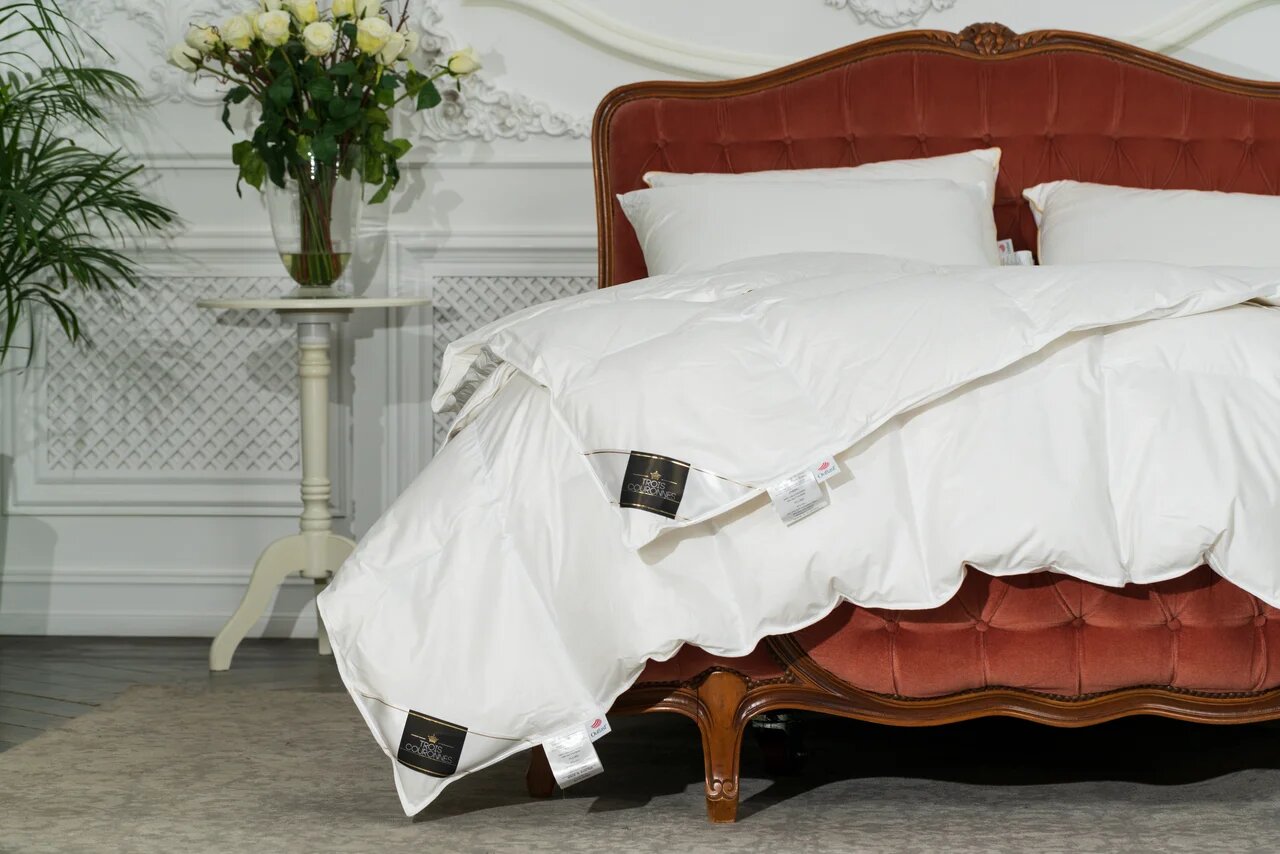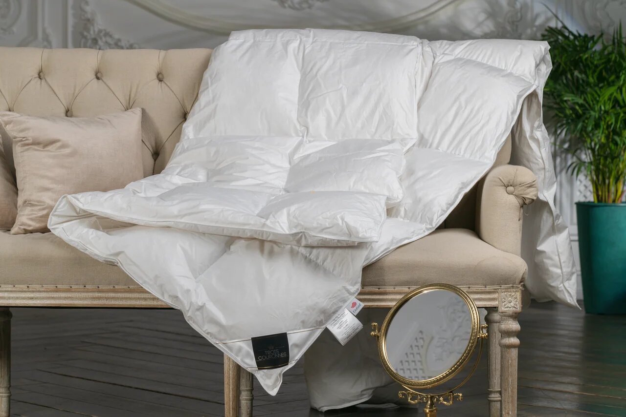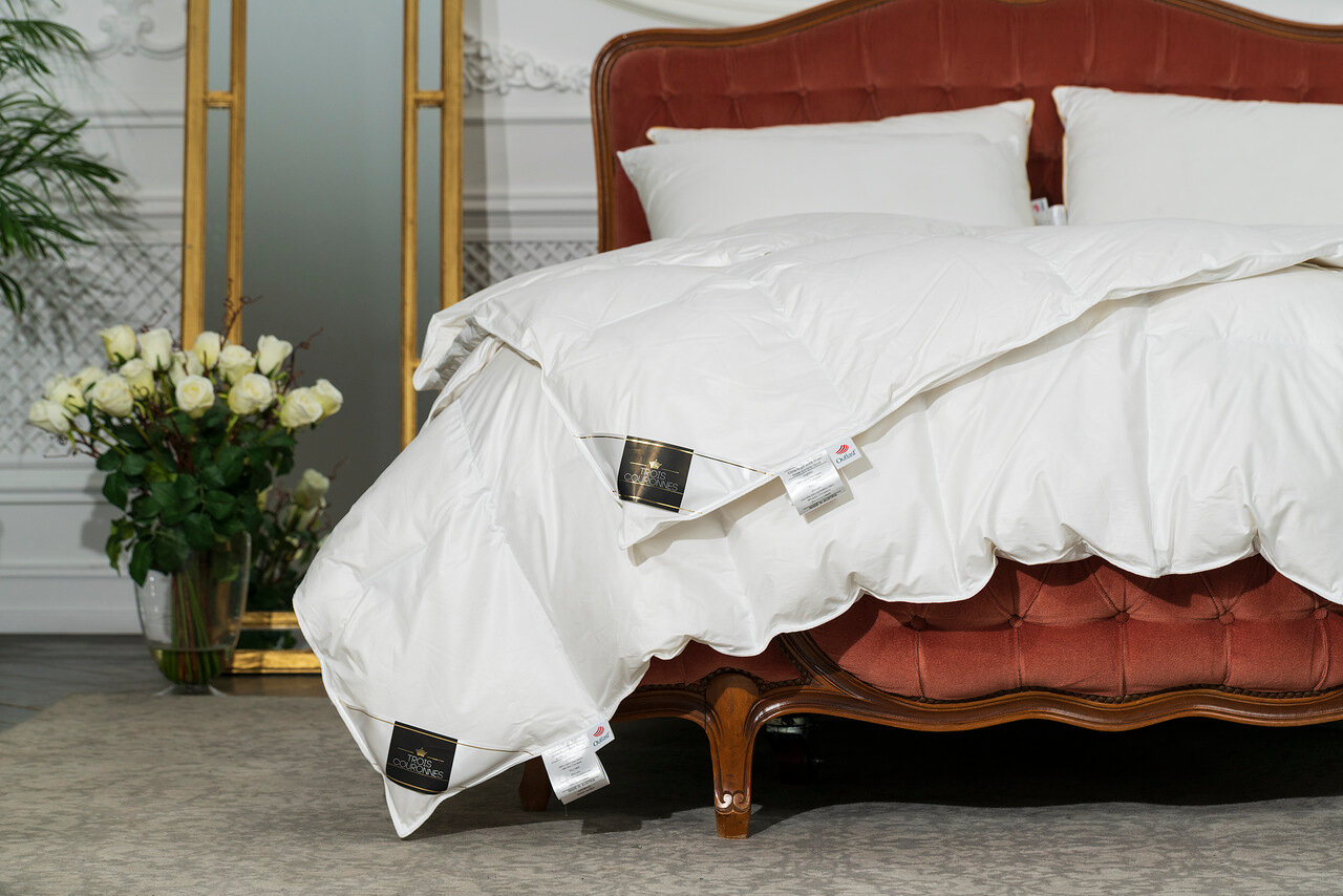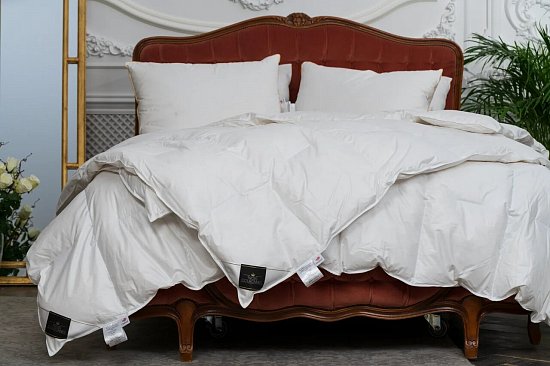 Всесезонное невесомое пуховое одеяло в нежнейшем батисте - на 100% состоит из высококачественного пуха мазурийских гусей первого класса.