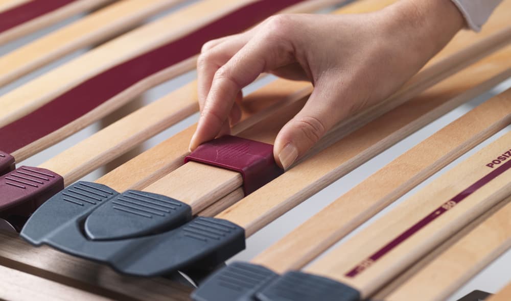 2. Надежные, тестированные на прочность - группы эластичных амортизаторов и скользящие регуляторы жесткости.  Можно регулировать жесткость каждого амортизатора, каждой половины спального места в зависимости от веса, комплекции и предпочтений спящего.  Регулируя упругость и натяжение ламелей, можно корректировать жесткость матраса.