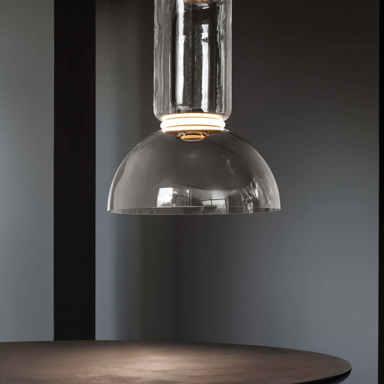 Современный подвесной светильник, олицетворяющий пронзительную чистоту и лаконичность исполнения. Состоит из стеклянных элементов: цилиндра и полусферы с источниками света в виде трёх кольцевых светодиодов. Оригинальное изделие гармонично дополняет интерьер как самостоятельный элемент, но также прекрасно смотрится в тандеме с подвесом из одноименной коллекции над обеденным столом или прикроватной зоной. Данная серия состоит из двух светильников разного размера и выразительного торшера. Высота подвеса может регулироваться за счет длины шнура.