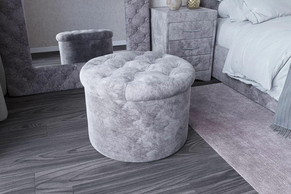 Круглый пуф Avanta  является стильным аксессуаром к одноименной кровати в коллекции компании PL.  Благородные глубокие утяжки декорированы текстильными пуговицами, которые могут быть в тон или контраст обивочному материалу самого пуфа. Так же возможен вариант декора стразами Svarowski (черные и белые).